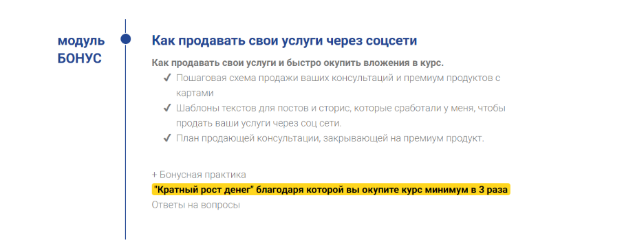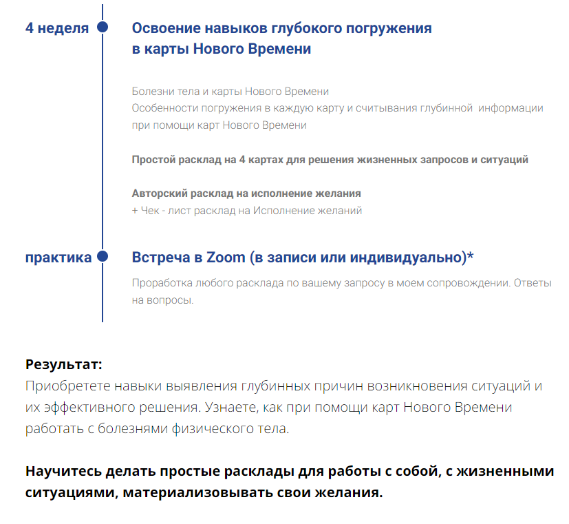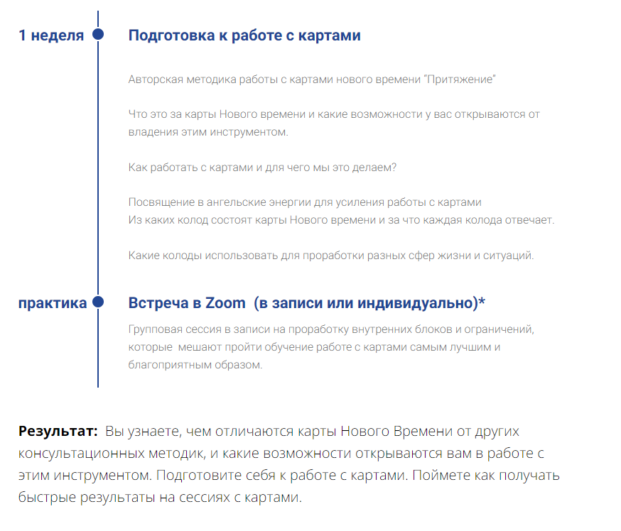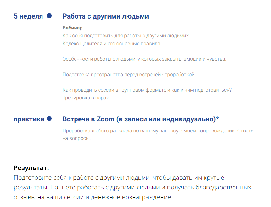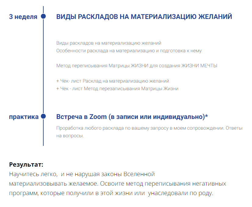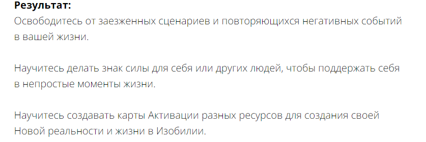 В результате прохождения всего курса вы получаете рабочий инструмент для создания своей реальности, материализации любых желаний. Благодаря ему вы сможете работать с собой и другими людьми, ссылаясь на метод с которым вы работаете и автора. Достойно зарабатывать и исполнять мечты.